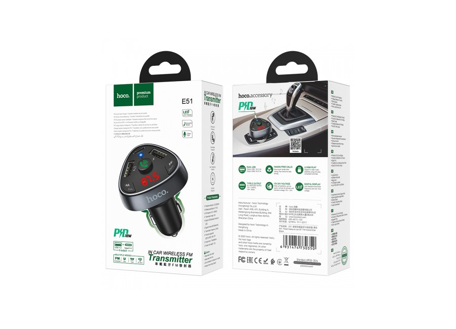 E51 Road Treasure მანქანის დამტენი BT V5.0 FM გადამცემი ორმაგი USB გამომავალი 3.1A და Type-C გამომავალი 18W