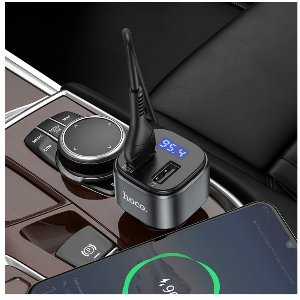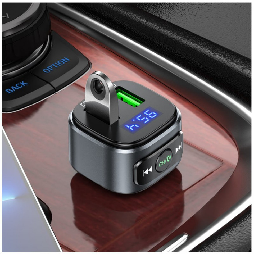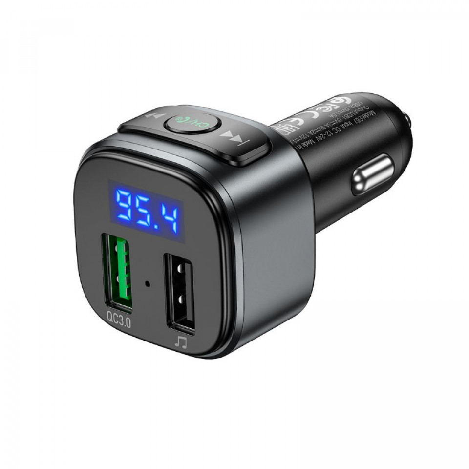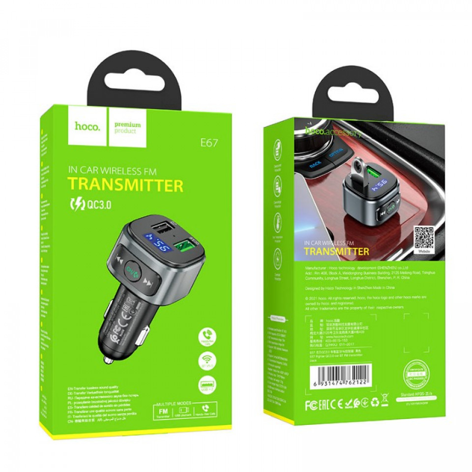 E67 Fighter, car charger with USB 18W + USB 5V / 1.5A output with wireless FM transmitter, support BT and USB flash drive playback.