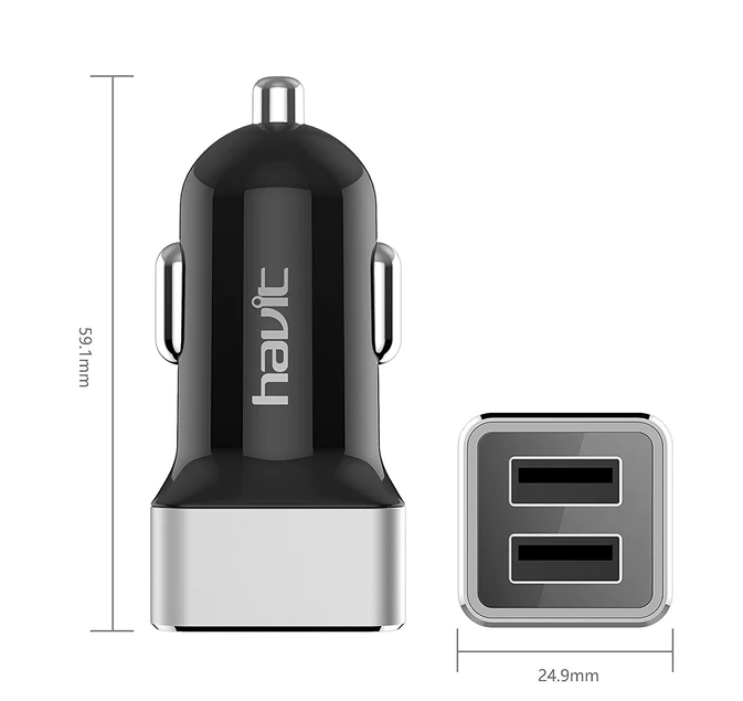 Simple and compact design, it is the smallest and lightest USB car charger with 2.4 A output in the market with dual USB output. With the elegant and handy shape, it is - we are sure - pleasant to carry.