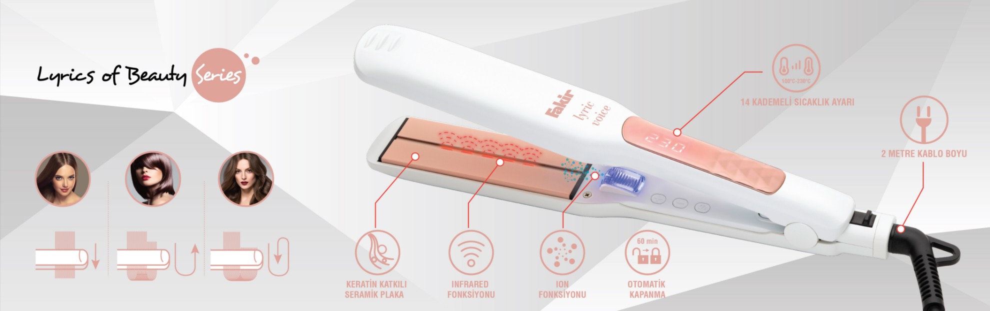 ინფრაწითელი ტექნოლოგიის გამოყენებით, გათბობის სისტემის ორმაგი ეფექტით ამცირებს თმის დაზიანებას და უზრუნველყოფს აბრეშუმისებრ, თანაბარ იერს დიდი ხანის განმავლობაში.(წითელი ნათება)