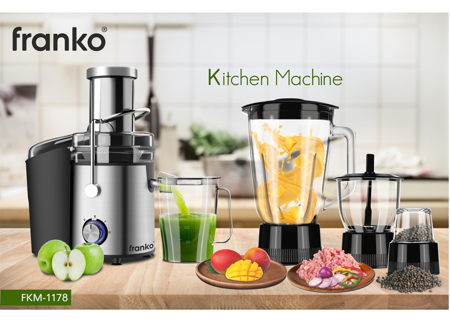 სამზარეულო მანქანა; წვენსაწური, ბლენდერი, ჩოპერი, საფქვავი 800W; ექსტრა დიდი 75 მმ შესანახი ჩიპი მთელი ხილისთვის; მბრუნავი გადამრთველი 2 სიჩქარით და იმპულსით; დამატებითი 1 ლ წვენსაწურის ჭიქა; ინარჩუნებს ვიტამინებს და ორიგინალურ არომატს; საკეტში ჩამრთველი უსაფრთხო გადამრთველი; ძრავის გადახურებისგან დაცვა; მოხსნადი ნაწილები მარტივი გაწმენდისთვის; უჟანგავი ფოლადის დანა; კონტეინერი